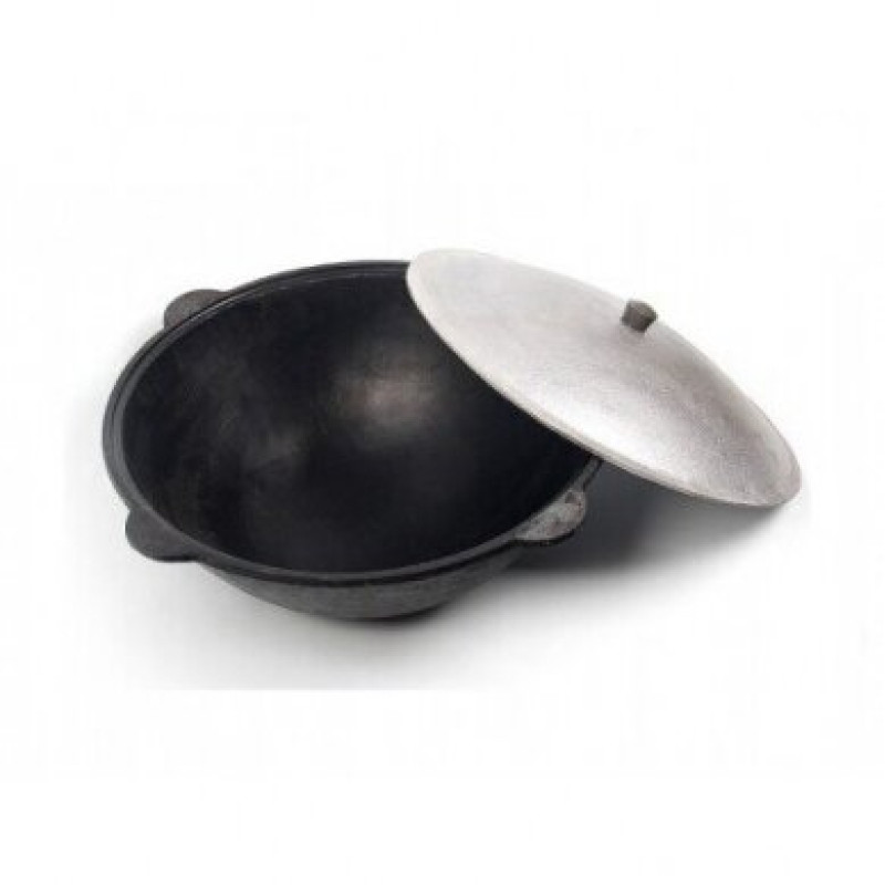 Uzbekistānas čuguna katls ar pulētu iekšējo virsmu. Komplektā alumīnija vāks.